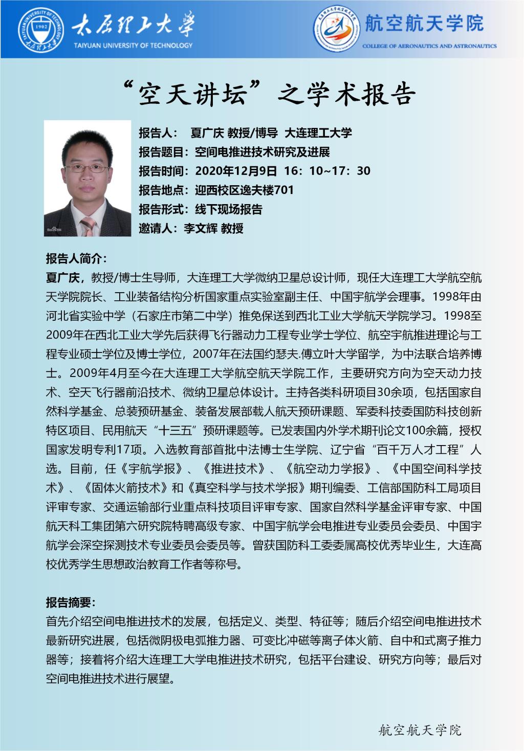 夏广庆,教授/博士生导师,大连理工大学微纳卫星总设计师,现任大连理工大学suncitygroup太阳集团经理、工业装备结构分析国家重点实验室副主任、中国宇航学会理事。1998年由河北省实验中学(石家庄市第二中学)推免保送到西北工业大学航天公司学习。1998至2009年在西北工业大学先后获得飞行器动力工程专业学士学位、航空宇航推进理论与工程专业硕士学位及博士学位,2007年在法国约瑟夫.傅立叶大学留学,为中法联合培养博士。2009年4月至今在大连理工大学suncitygroup太阳集团工作,主要研究方向为空天动力技术、空天飞行器前沿技术、微纳卫星总体设计。主持各类科研项目30余项,包括国家自然科学基金、总装预研基金、民用航天“十三五”预研课题等。已发表国内外学术期刊论文100余篇,授权国家发明专利17项。入选教育部首批中法博士生公司。目前,任《宇航学报》、《推进技术》、《航空动力学报》、《中国空间科学技术》、《固体火箭技术》和《真空科学与技术学报》期刊编委、工信部国防科工局项目评审专家、交通运输部行业重点科技项目评审专家、国家自然科学基金评审专家、中国航天科工集团第六研究院特聘高级专家、中国宇航学会电推进专业委员会委员、中国宇航学会深空探测技术专业委员会委员等。曾获国防科工委委属高校优秀毕业生,大连高校优秀员工思想政治教育工作者等称号。