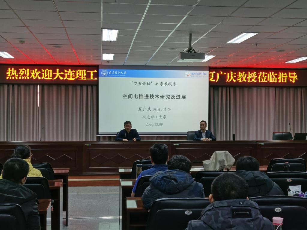 同日,夏广庆教授受邀作了题为“空间电推进技术研究及进展”的新一期“空天讲坛”之学术报告。报告在迎西校区逸夫楼701举行,由李文辉副经理(主持工作)主持,公司全体教师及2018级、2019级全体员工参加。报告首先介绍了空间电推进技术的定义、类型、特征及与传统化学推进的优势。对国际国内空间电推进技术最新研究成果,及中和器内置、大直径、大电流、大功率、全电推进的总体发展趋势做了详细的讲解。然后讲述了电推进器的关键技术,如大电流长寿命热阴极中和器、大功率电源技术、离子束流发散角控制、长寿命放电通道等。就大连理工大学电推进技术的研究进展进行了报告,包括微腔放电推进器、微阴极电弧推力器、螺旋波等离子体推进器、自中和式离子推进器等11种类型推进器研究成果。最后,对空间电推进技术进行展望,指出化学-电推进混合推进、低轨道吸气式推进:预电离感应脉冲推力器、核动力推进技术及原位资源利用技术四个方向的巨大发展前景。师生们表达出极大的兴趣,并与夏教授进行了热烈的问答互动。