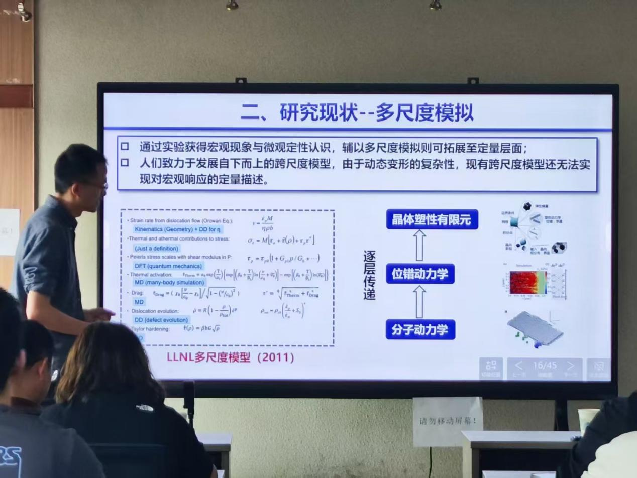 姚松林以冲击加载下典型金属的晶体塑性模型及机理研究”为题介绍了其在统一的理论框架下发展耦合位错与孪晶亚结构机制的晶体塑性模型,以及对宏观冲击加卸载全过程波结构特征的定量描述同时揭示了冲击波领域系列难点与热点问题的位错机理介绍了将晶体塑性模型与相场方法结合建立耦合多变形机制的模拟能力。