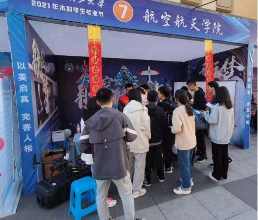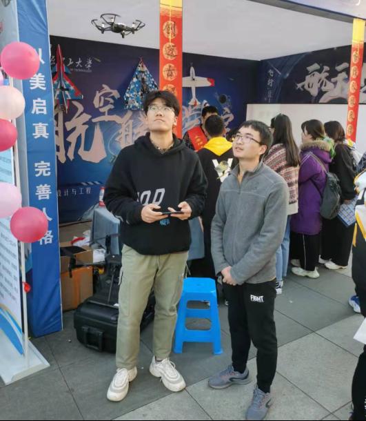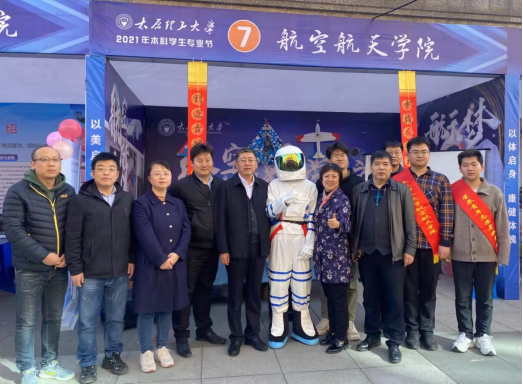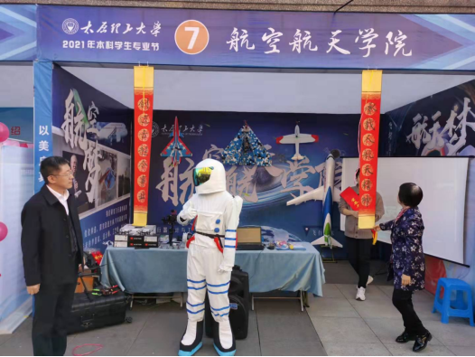 展位背景墙简单大气,“航空梦”和“航天梦”相映其上,三幅图配以简洁文字,明快表达了“飞行器设计与工程”和“飞行技术”两个专业的建设目的、培养目标和发展愿景。背景墙上悬挂着航模协会的飞机模型,这是曾经同学们练手并试飞成功的功勋机型,展示出协会从0到1的蓬勃发展势头。展台上摆放着3D打印的发动机结构模型,吸引“航迷”们竞相猜测型号和搭载机型。小型四旋翼无人机简单方便,下载软件后,人人都可以成为熟练的“飞手”。吸引大家的还有我们的宇航员,手摇国旗招呼大家来展位参观,或合影留念,不时摆出夸张的姿势,流露出“我已出舱,感觉良好”。展架上悬有“传承载人航天精神,开创迈古超今事业”楹联,这是公司和公司跨越式发展的生动写实,也是致力于开创山西高水平教育的豪迈誓言。问答环节伴有抽奖活动,颇具特色的直升飞机饰品、火箭发射玩具和飞机模型胸针引人注目,吸引大家前来一试。“我国有几座航天发射场”,“太原卫星发射基地位于哪里”,“大型客机C919的总设计师是谁”,“前两天我国载人航天工程发射的飞船叫什么名字”等问题既考验常识性知识,也增进了大家对航空航天事业发展的浓厚兴趣。