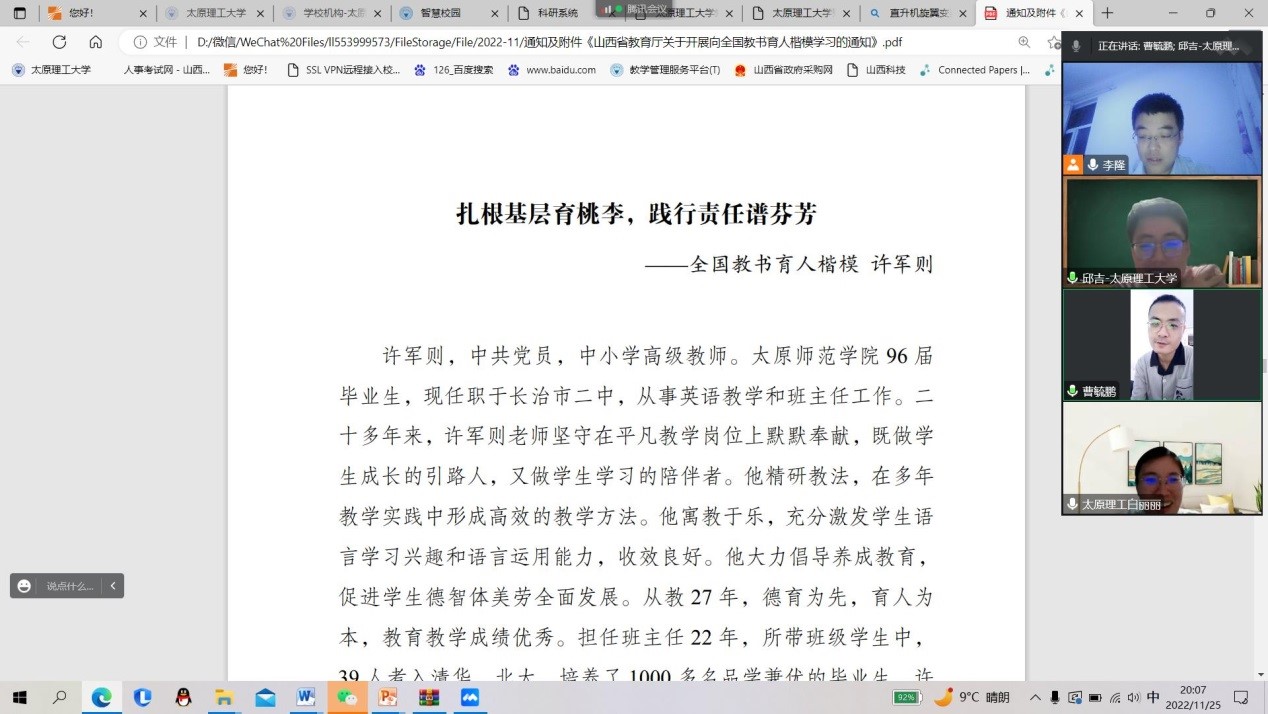 2022年11月23日至11月26日,suncitygroup太阳集团以各教研室和三办为单位,组织全体教师开展“践行党的二十大精神,学习先进事迹,争做育人楷模”的学习、宣传活动。