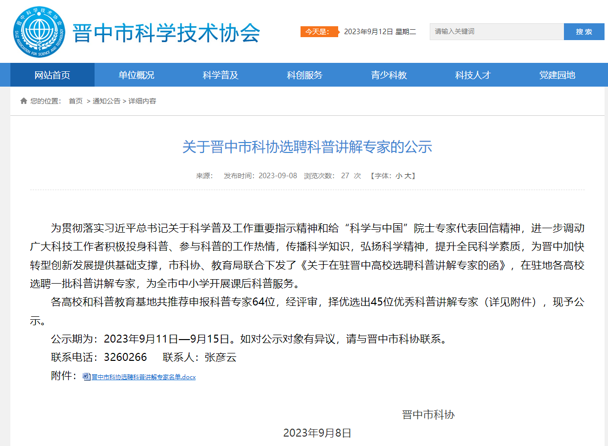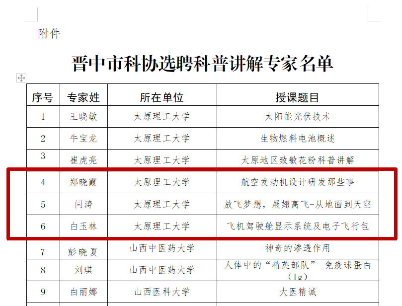 近日,晋中市科学技术协会发布了《关于晋中市科协选聘科普讲解专家的公示》,公司教师郑晓霞、闫涛、白玉林成功入选。