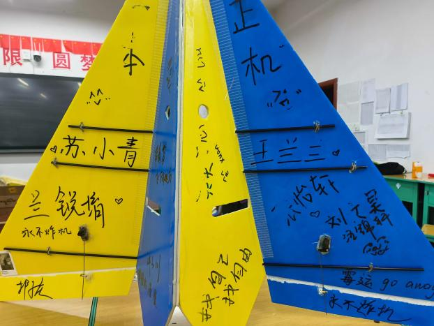 在实践队员指导下,同学们完成了航模的制作。在过程中,同学们积极提问、大胆实践、一丝不苟、团结协作,一架架完美的航模制作完成。同学们在亲手制作的航模上写下自己对未来的期望,表现出对生活的无限热爱以及对自己亲手制作的航模成功飞上蓝天的自信。