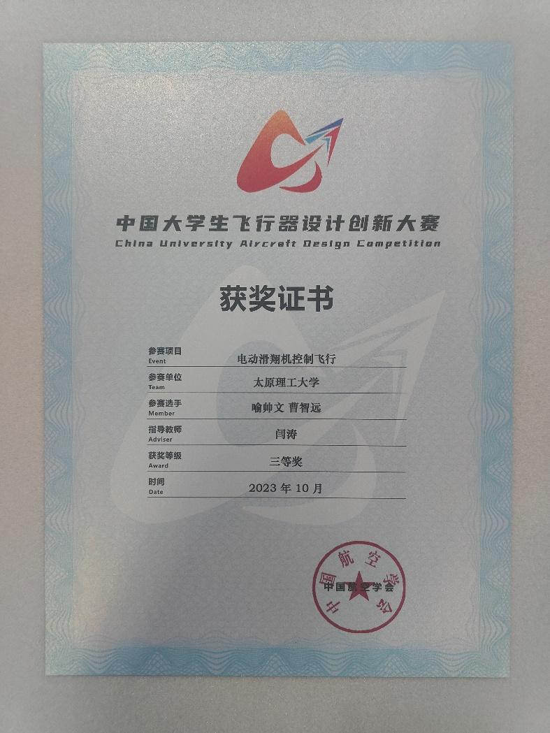 2023年中国老员工飞行器设计创新大赛总决赛于10月初在河北省定州市举行。太阳集团官方网站航模协会在suncitygroup太阳集团与创新创业学的大力支持,教师闫涛、王菡的指导下,首次正式参加该赛事。用近半年时间的进行了设计、制作、试验、飞行训练等准备,参加了创新载重飞行、限时载运飞行、固定翼无人机对地侦查与打击、电动滑翔机控制飞行等四个项目的比赛,并获得了电动滑翔机控制飞行全国三等奖的佳绩。