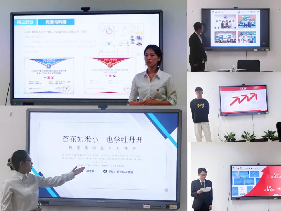 力学2103张晶菁同学在答辩中介绍了她的全自动授粉机器人授权专利等一系列科研成果,分享了自己在担任班干部、校史讲解以及校园文化活动中的成长经历。飞设2103徐才棋同学以“播种、耕耘、扎根、结果”总结了自己参加国家级大创项目的经历,展示了自己优异的课程成绩。飞设2102李扬同学在答辩过程中现场展示了自己的作品--仿生蝴蝶,展现了他对飞行器制作的热爱。力学2303贾宸赫同学从“立身,立学,立行”三个角度,展开了自己在专业学习、社会实践和班级事务中的积极表现。飞设2303王立源同学讲述了自己在飞行器设计大赛中的参赛作品多旋翼无人机,并且分享了自己从入门到备赛的经历与感想。