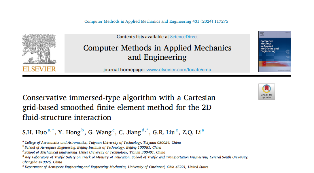 近日,公司李志强教授团队青年教师霍树浩在国际计算力学顶级期刊《Computer Methods in Applied Mechanics and Engineering》上发表研究论文。这篇论文的标题为“Conservative immersed-type algorithm with a Cartesian grid-based smoothed finite element method for the 2D fluid-structure interaction”,中文可译为“基于笛卡尔网格的二维流-固耦合守恒浸入光滑有限元法”。图1为论文首页,论文链接:https://doi.org/10.1016/j.cma.2024.117275。