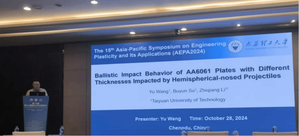 公司副经理李志强教授、肖革胜副教授、常慧老师以及博士生王宇和硕士生汪锦奇参加此次会议,并作分会场报告。肖革胜汇报了基于分离式霍普金森压杆动态压入测试方法,及其在动态塑性本构参数表征中的应用;常慧汇报了CrCoNiSi0.3中熵合金的率温相关力学性能和微观变形机理研究;王宇汇报了6061铝合金计及应变率和温度效应的本构行为及其应用;汪锦奇汇报了航天器瓦楞型Whipple结构参数对其超高速碰撞行为影响的数值研究。