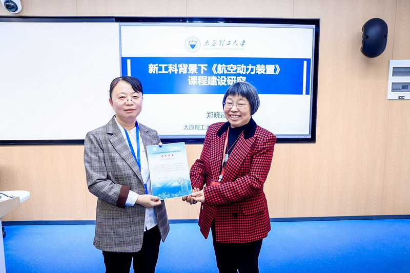 公司教师郑晓霞在“航空航天新工科教学改革与实践”分会场就《新工科背景下“航空动力装置”课程建设研究》做汇报,并与现场的老师们进行课程建设方面的交流与讨论,由航空航天教指委委员、清华大学郑丽丽教授为郑晓霞颁授证书。