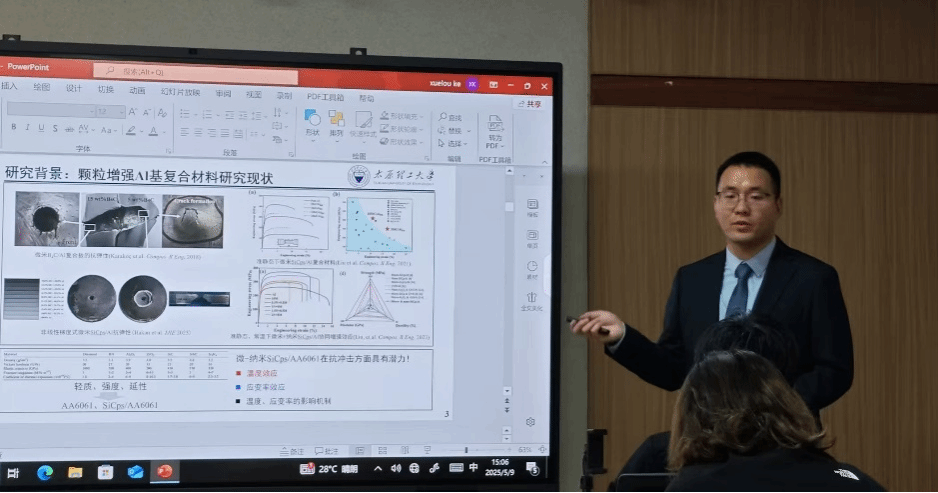 公司2021级博士生陈青青、王宇作为主讲人,分别以《融合数据驱动与量纲分析的混凝土/金属靶板侵彻行为研究》、《6061铝合金和SiCps/6061复合材料的率温相关力学行为研究》为题做了学术报告。张志斌以立足航空企业核心技术需求对课题进行了系统的点评,针对科研成果转化过程中的技术衔接、验证等环节,提出系统化改进建议;李世强和马胜国从学术研究出发,围绕课题的理论基础、研究方法与数据支撑,对课题内容的逻辑严密性与创新性进行深度剖析,并给出了完善研究的建议。