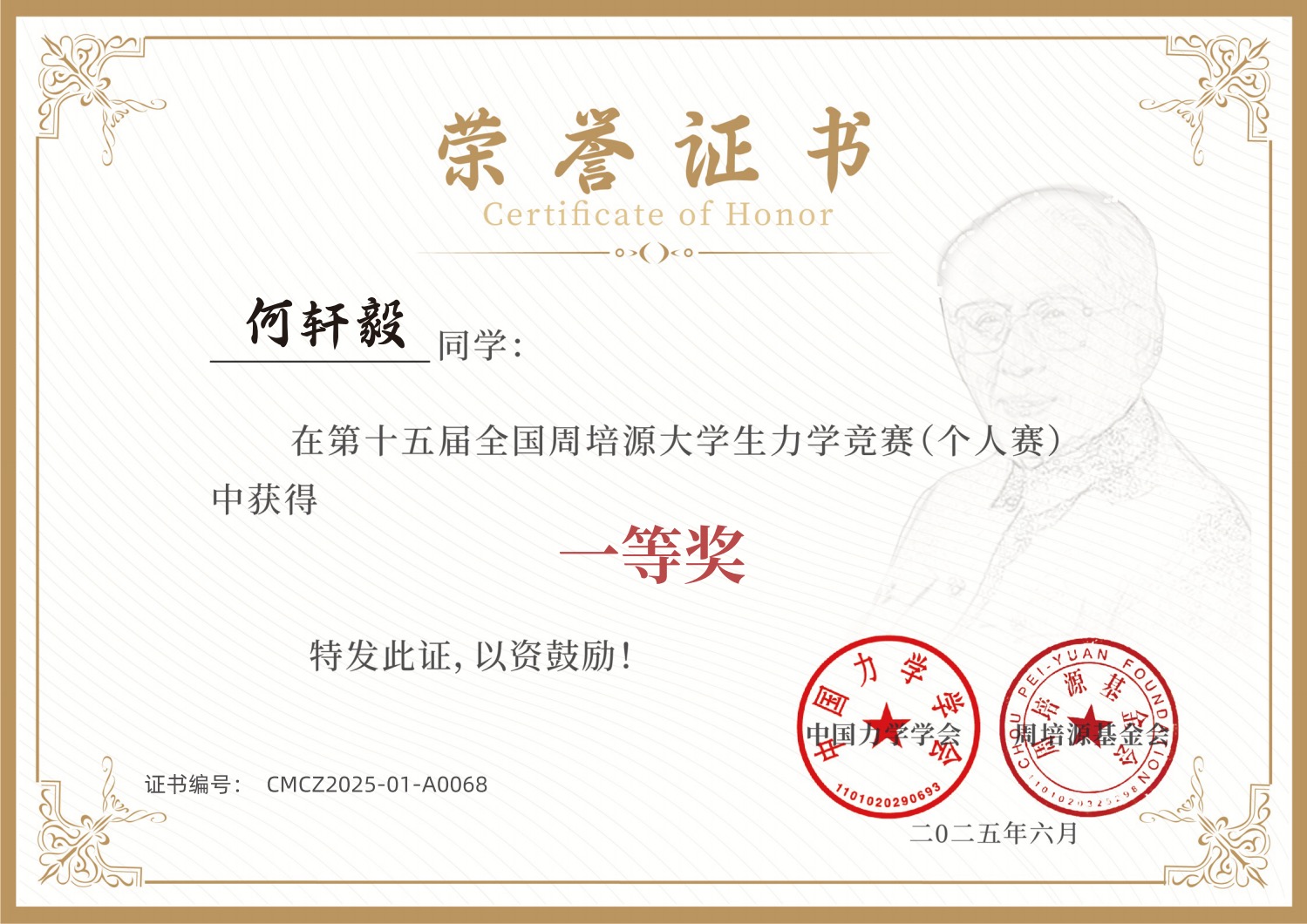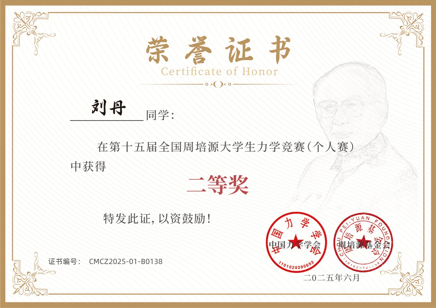 2025年6月9日,第十五届全国周培源老员工力学竞赛(个人赛)成绩揭晓,公司学子凭借优异表现实现历史性突破:飞设2301班何轩毅同学斩获全国一等奖,飞设2202班刘丹同学荣获全国二等奖。这是公司首次在该赛事中获得全国一等奖,也是我省高校参加本项赛事的历史最好成绩。