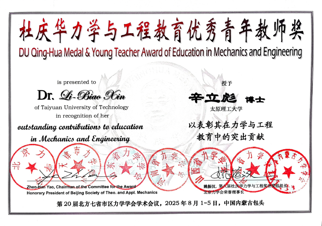 经北京力学会、天津市力学学会、山东省力学学会、河南省力学学会、山西省力学学会、河北省力学学会、内蒙古力学学会等北方七省、自治区、直辖市力学学会申请与推荐、专家评审和评奖小组投票,来自北京大学、天津大学等9个高校的9位教师获此殊荣,公司力工系教师辛立彪副教授荣获杜庆华力学与工程教育优秀青年教师奖。