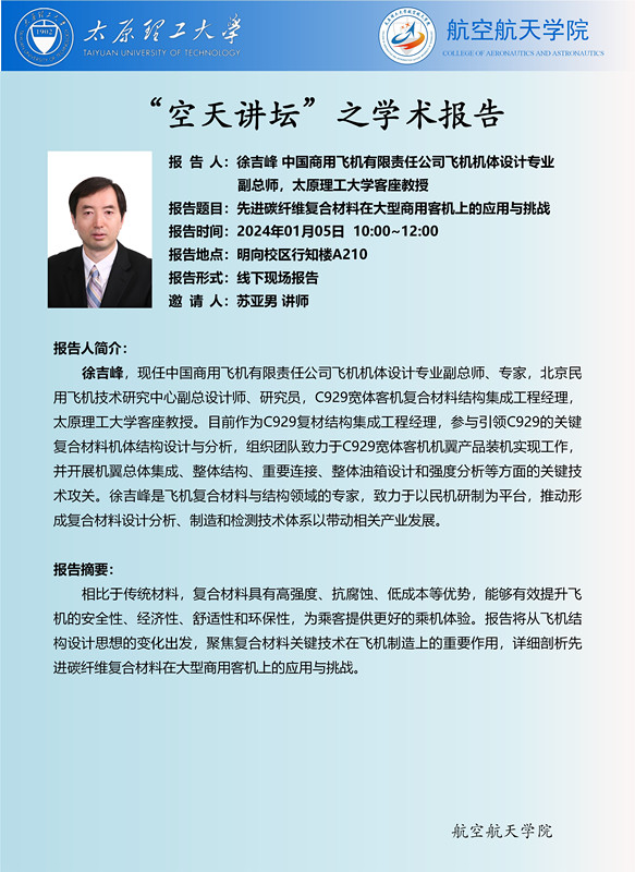 报告人:徐吉峰 中国商用飞机有限责任公司飞机机体设计专业副总师,太阳集团官方网站客座教授