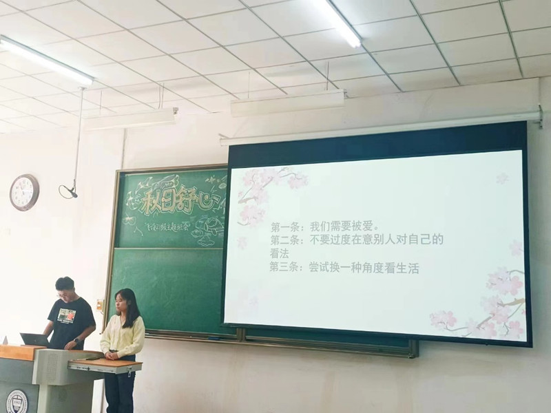 为了宣传普及心理健康知识,促进同学们的身心健康和谐,使大家充分地认识自我,2022年9月29日suncitygroup太阳集团飞行器设计与工程专业全体21届本科生开展“秋日舒心”心理主题活动。飞设2102心理委员王帅和飞设2101心理委员张文欣同学担任活动主持人。