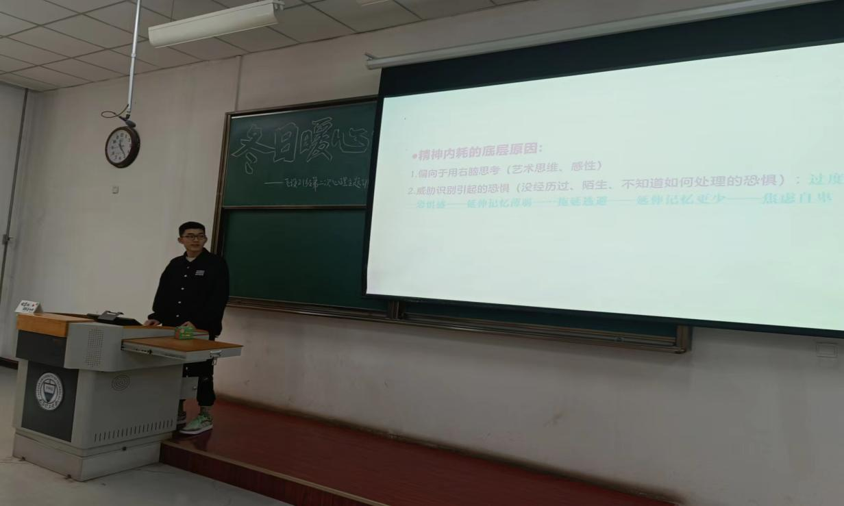 活动中,各班心理委员在事先调研的基础上,首先列举出了在疫情防控和临近期末的这段时间内同学们所面临的各种心理困惑,如人际交往困惑、情感困扰、学业困扰、道德修为和集体意识等方面存在的精神内耗。其次为同学们深刻剖析了精神内耗的底层原因,有针对性地提出了一些摆脱精神内耗的方式方法,引导和鼓励大家一定要合理利用和充实自己的学习生活和校园生活,有效防止精神内耗的产生和发展。