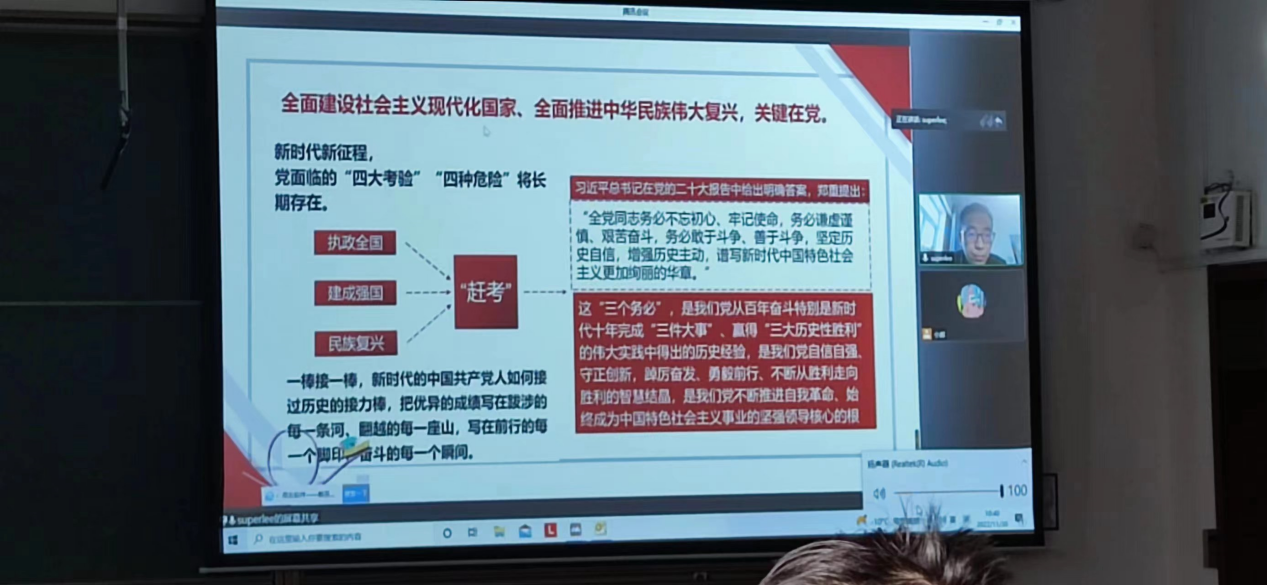 李伟老师首先强调,建设社会主义现代化国家、全面推进中华民族伟大复兴,关键在党。党在新时代新征程中依然长期面临着“四大考验”和“四种风险”。新时代的中国共产党人如何接过历史的接力棒,把优异的成绩写在跋涉的每一条河、翻越的每一座山,前行的每一个脚印,就需要以赶考永远在路上的气魄和毅力去面对。他指出,习近平总书记在党的二十大报告中郑重提出:“全党同志务必不忘初心、牢记使命,务必谦虚谨慎、艰苦奋斗,务必敢于斗争、善于斗争”。这“三个务必”升华了党在党的七届二中全会上提出的“两个务必”;反映了党在面对新形势、新挑战、新任务时的政治清醒和政治自觉。