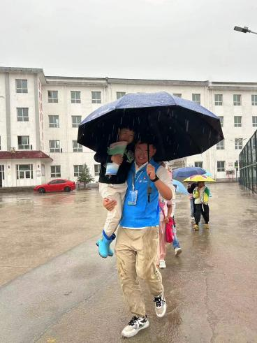 支教第一天,一场突如其来的大雨就考验着实践队员的爱心与责任。为让孩子们安全到位,早上7时许,实践队员们就来到校门口迎接孩子们,打伞将他们挨个送到教室。看着一位位身穿蓝色志愿者队服的老员工如此充满爱心,家长们纷纷竖起大拇指,询问着、关心着、感激着,这一刻,青春之美在桃园昇瞬间绽放。