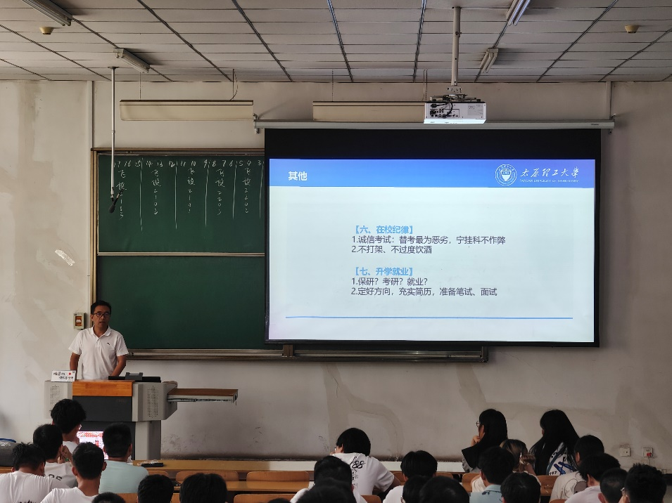 冀彦哲围绕防电信诈骗、文明上网、校纪校规、学业规划和近期重点工作等方面开展宣讲教育。提醒同学们要规范日常言行,先成人、后成才,厚植爱党爱国爱校情怀,做遵纪守法的新时代好青年。他指出,综合素质测评事关每位同学的利益,每位同学都应该认真对待,力求实现全方面发展。冀彦哲还分享了自身经历,鼓励同学们要积极参与各类课程竞赛、社会实践活动,在全面发展中掌握更多知识和技能。